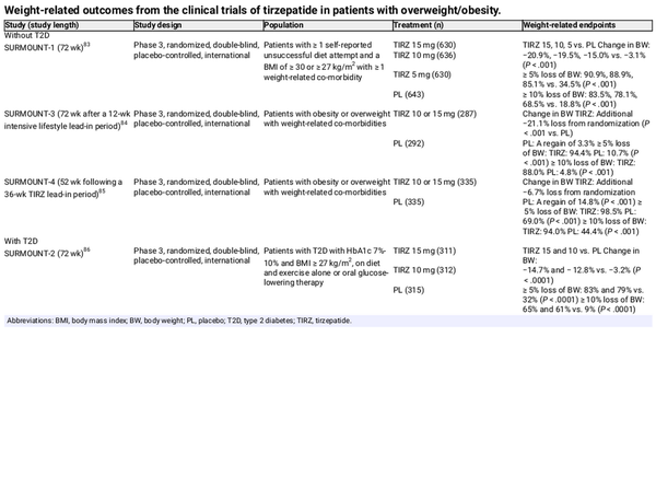 - 86. Garvey WT, Frias JP, Jastreboff AM, et al. Tirzepatide once weekly for the treatment of obesity in people with type 2 diabetes (SURMOUNT‐2): a double‐blind, randomised, multicentre, placebo‐controlled, phase 3 trial. Lancet. 2023;402(10402):613–626.