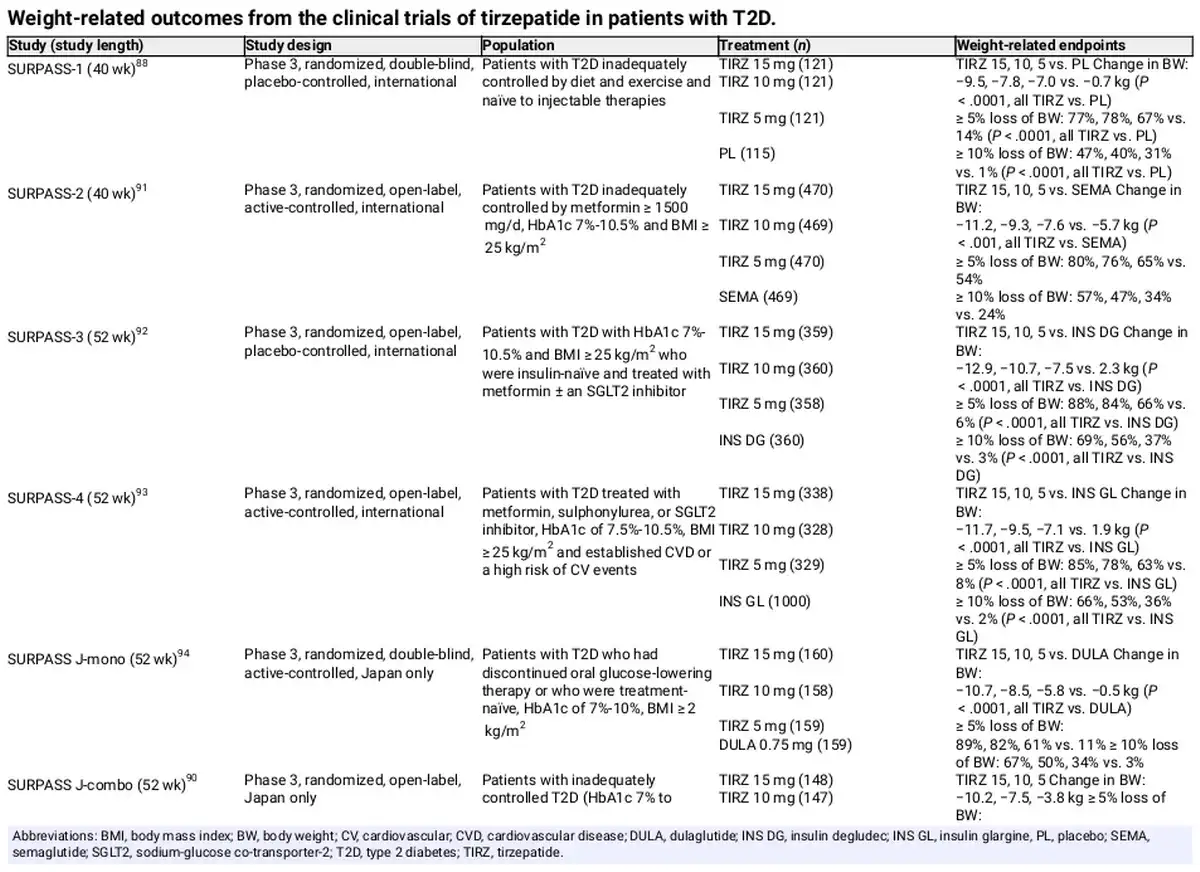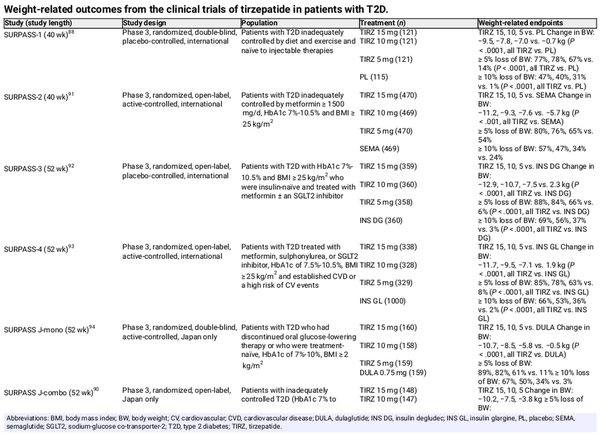 - 90. Kadowaki T, Chin R, Ozeki A, Imaoka T, Ogawa Y. Safety and efficacy of tirzepatide as an add‐on to single oral antihyperglycaemic medication in patients with type 2 diabetes in Japan (SURPASS J‐combo): a multicentre, randomised, open‐label, parallel‐group, phase 3 trial. Lancet Diabetes Endocrinol. 2022;10(9):634–644.