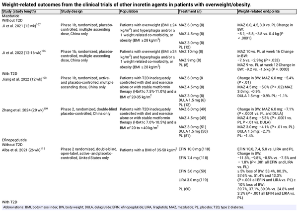 - 109. Zhang B, Cheng Z, Chen J, et al. Efficacy and safety of mazdutide in Chinese patients with type 2 diabetes: a randomized, double‐blind, placebo‐controlled phase 2 trial. Diabetes Car. 2024;47(1):160–168.