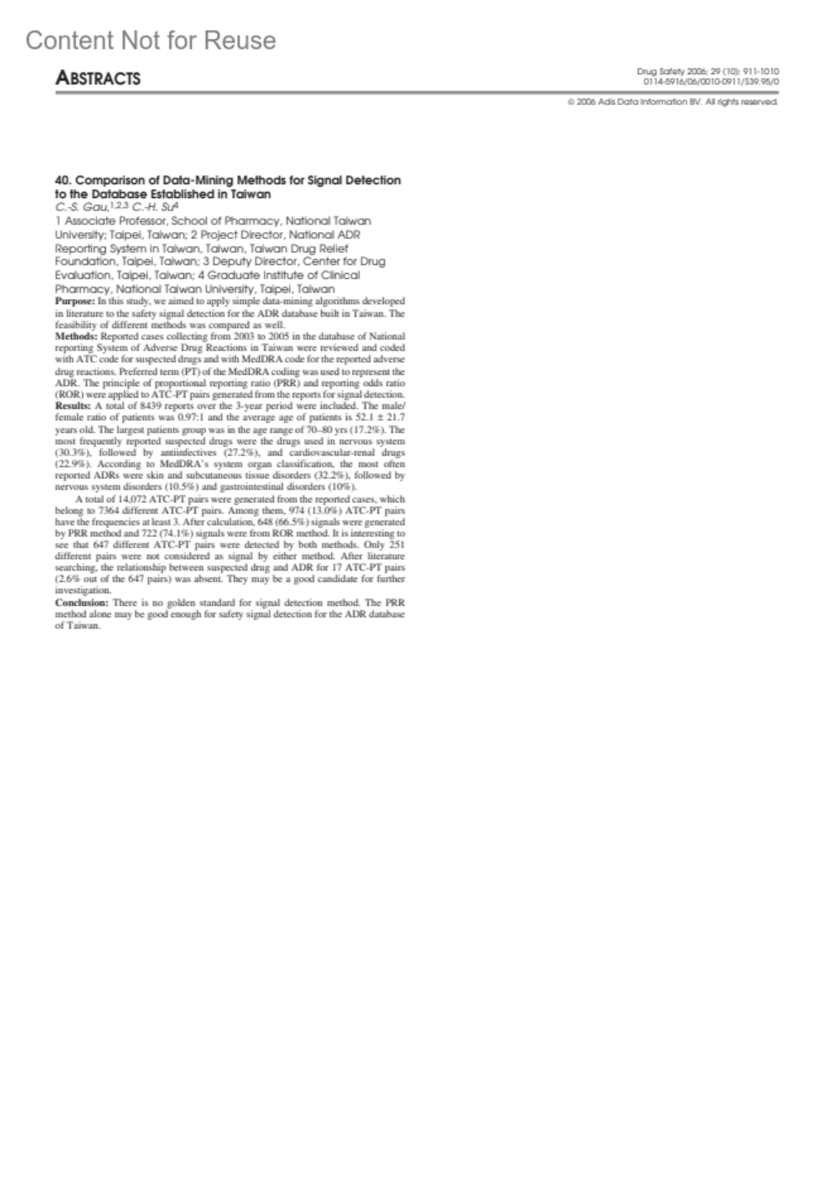 Comparison of Data-Mining Methods for Signal Detection to the Database Established in TaiwanGau, C.-S.Su, C.-H.Author information1 Associate Professor, School of Pharmacy, National Taiwan UniversityTaipei, Taiwan2 Project Director, National ADR Reporting System in Taiwan, Taiwan, Taiwan Drug Relief Foundation, Taipei, Taiwan3 Deputy Director, Center for Drug Evaluation, Taipei, Taiwan4 Graduate Institute of Clinical Pharmacy, National Taiwan University, Taipei, TaiwanDrug Safety 29(10):p 911-1010, 2006.Copyright © 2006 Adis Data Information BV