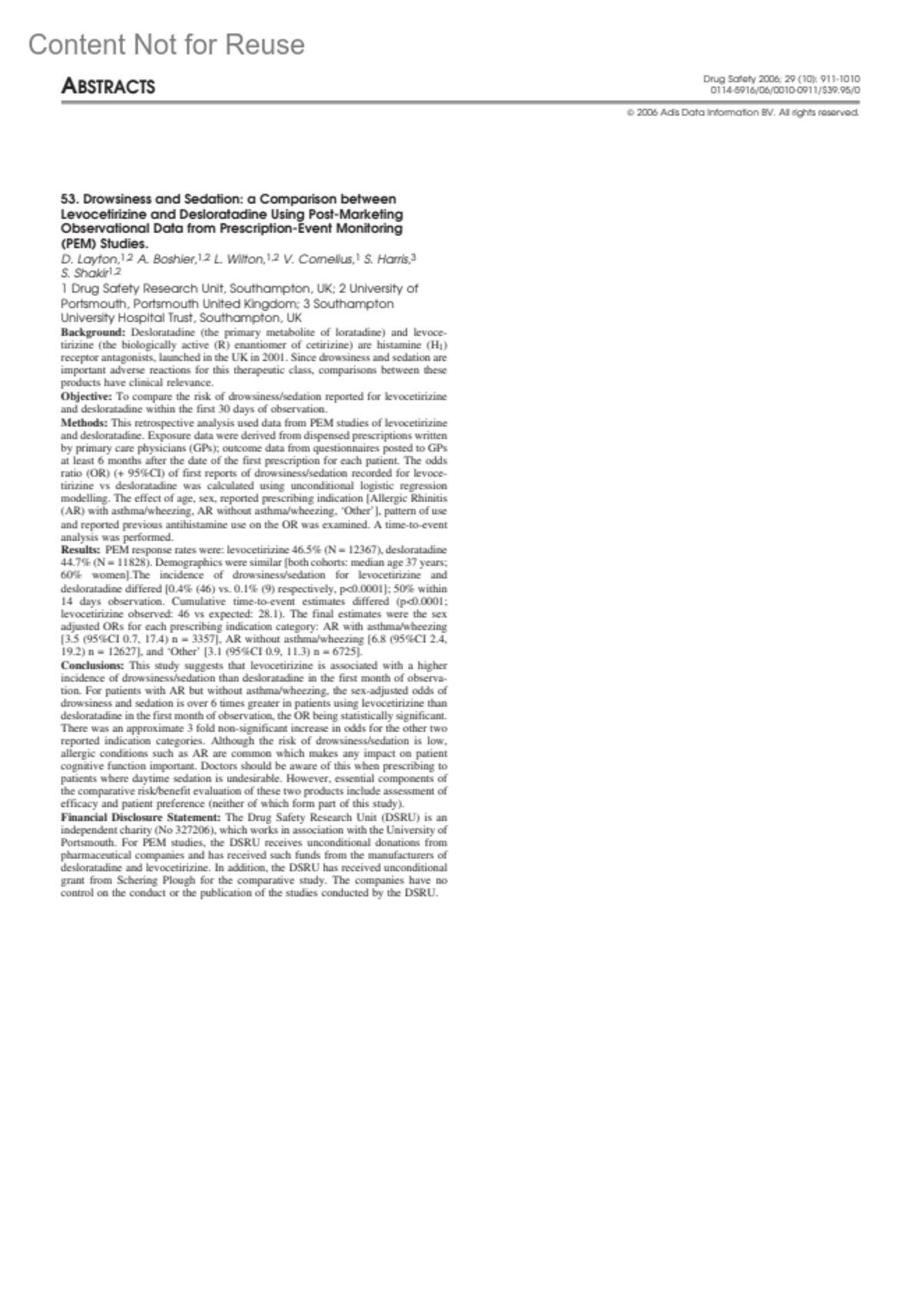 Drowsiness and Sedation: a Comparison between Levocetirizine and Desloratadine Using Post-Marketing Observational Data from Prescription-Event Monitoring (PEM) Studies.