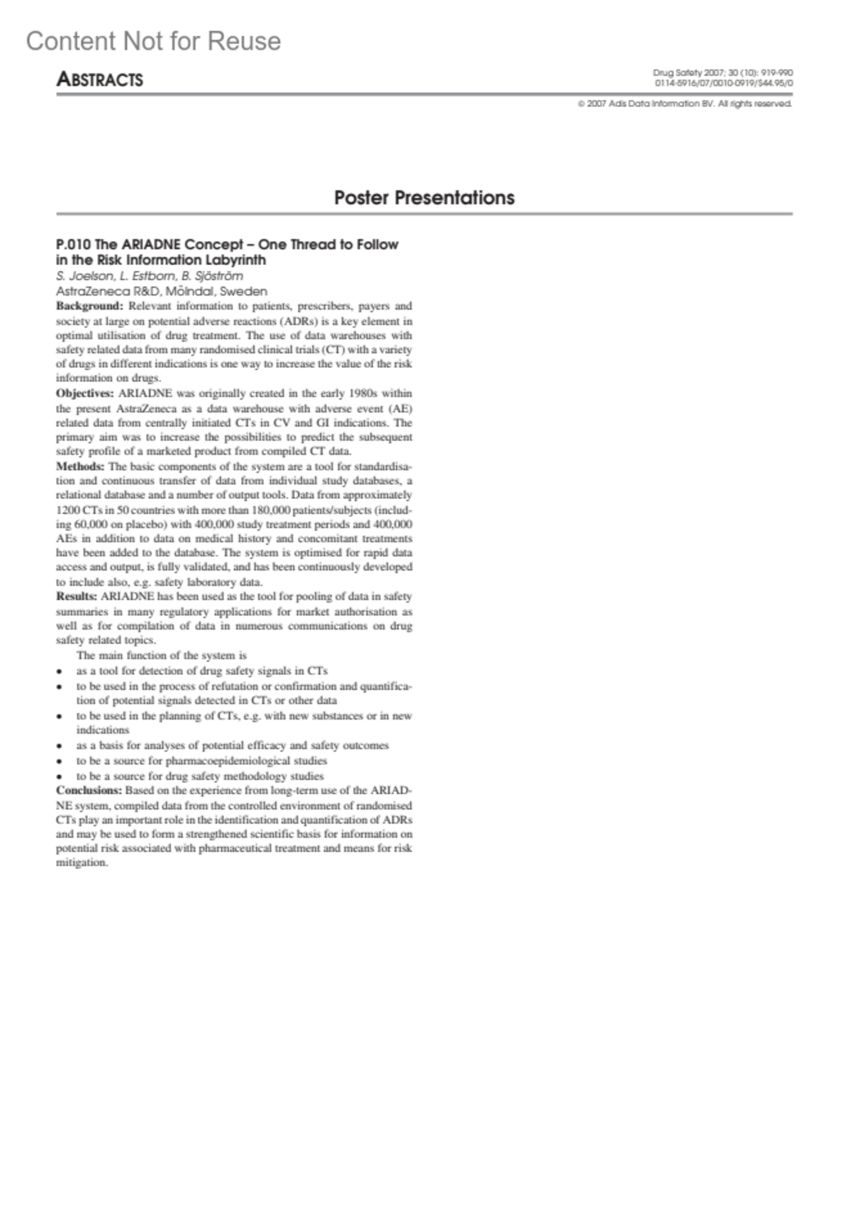 The ARIADNE Concept – One Thread to Follow in the Risk Information LabyrinthJoelson, SEstborn, LSjöström, BAuthor informationAstraZeneca R&D, Mölndal, SwedenDrug Safety 30(10):p 919-990, 2007.Copyright © 2007 Adis Data Information BV