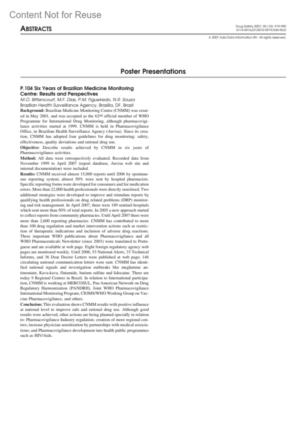 Six Years of Brazilian Medicine Monitoring Centre: Results and PerspectivesBittencourt, M ODias, M FFigueiredo, P MSouza, N RAuthor informationBrazilian Health Surveillance Agency, Brasilia, DF, BrazilDrug Safety 30(10):p 919-990, 2007.Copyright © 2007 Adis Data Information BV