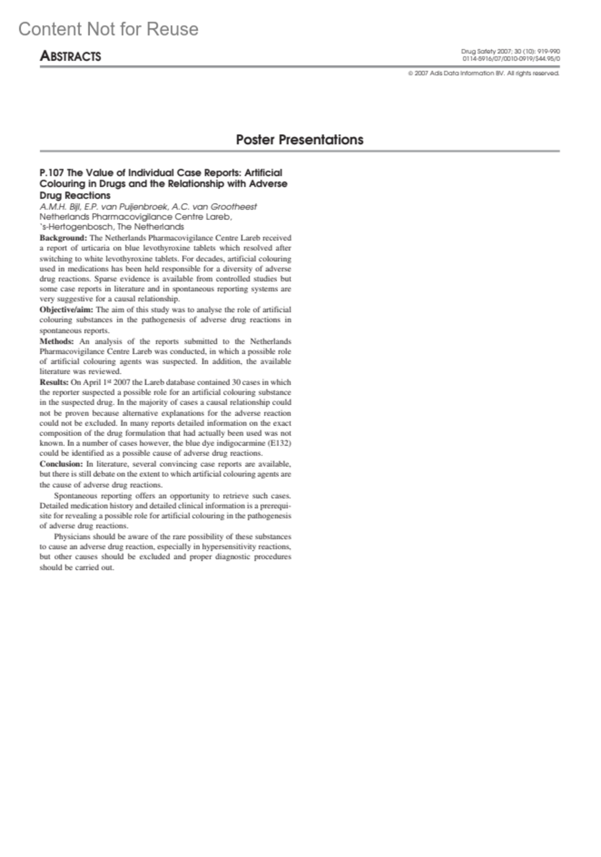 The Value of Individual Case Reports: Artificial Colouring in Drugs and the Relationship with Adverse Drug ReactionsBijl, A MHvan Puijenbroek, E Pvan Grootheest, A CAuthor informationNetherlands Pharmacovigilance Centre Lareb, ‘s-Hertogenbosch, The NetherlandsDrug Safety 30(10):p 919-990, 2007.Copyright © 2007 Adis Data Information BV
