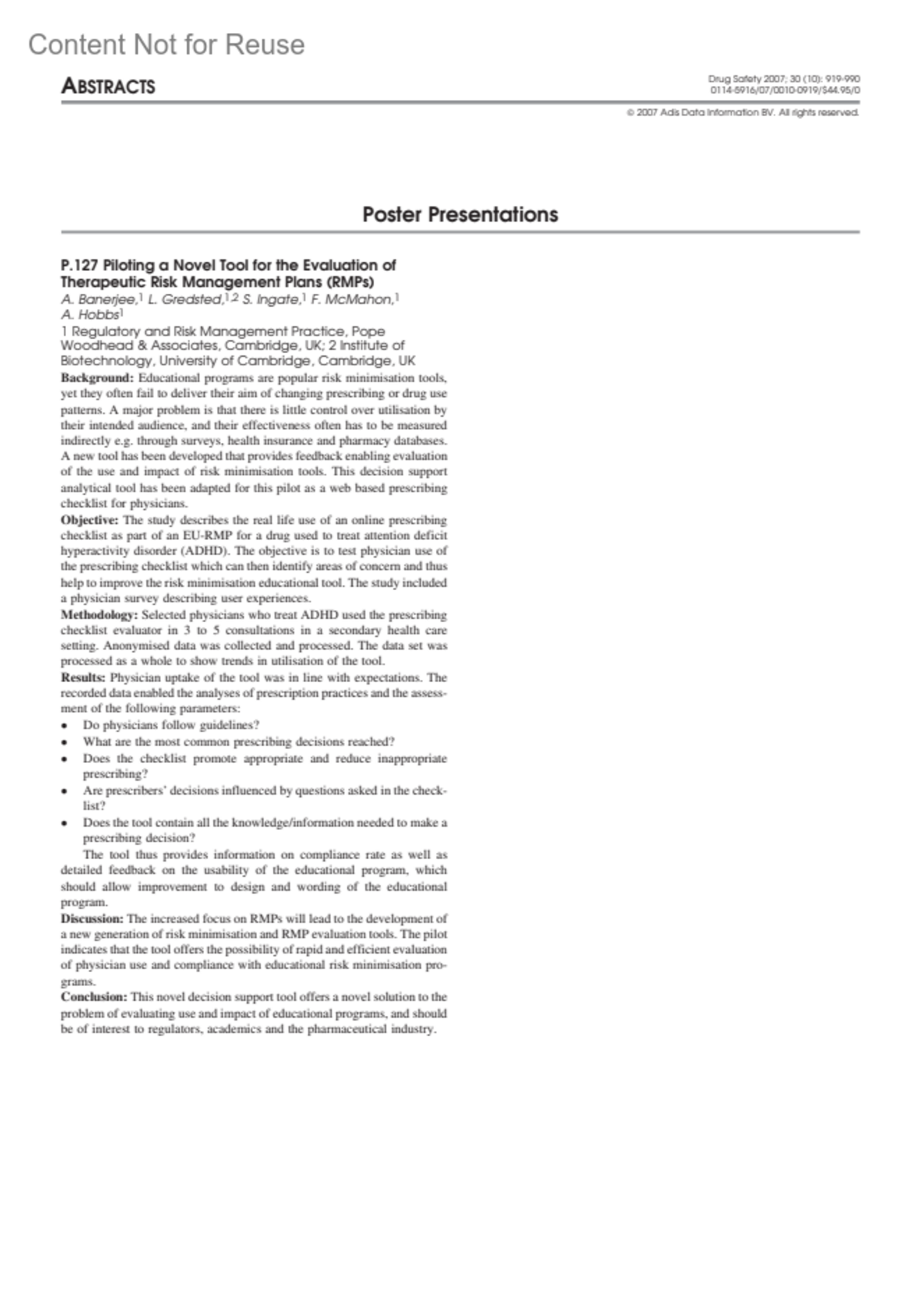 Piloting a Novel Tool for the Evaluation of Therapeutic Risk Management Plans (RMPs)Banerjee, AGredsted, LIngate, SMcMahon, FHobbs, AAuthor information1 Regulatory and Risk Management Practice, Pope Woodhead & Associates, Cambridge, UK2 Institute of Biotechnology, University of Cambridge, Cambridge, UKDrug Safety 30(10):p 919-990, 2007.Copyright © 2007 Adis Data Information BV