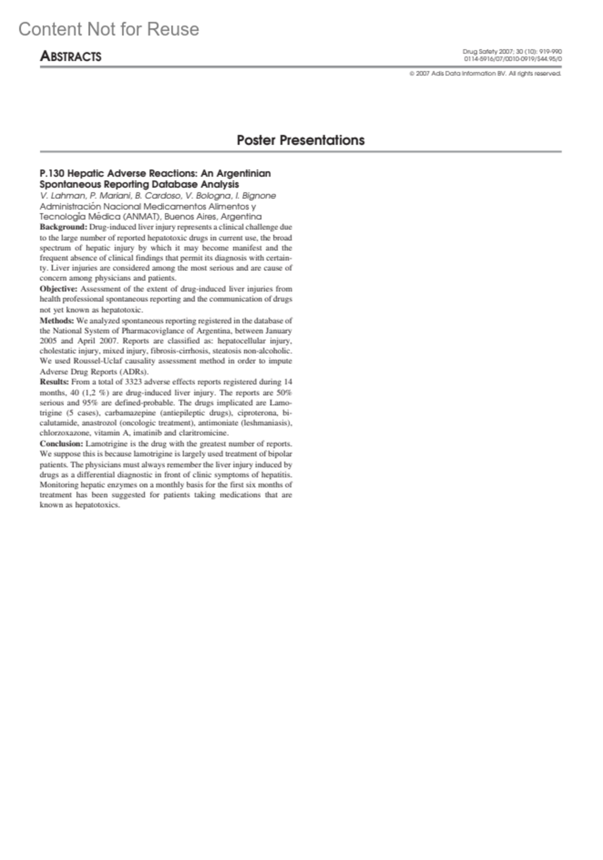 Hepatic Adverse Reactions: An Argentinian Spontaneous Reporting Database AnalysisLahman, VMariani, PCardoso, BBologna, VBignone, IAuthor informationAdministración Nacional Medicamentos Alimentos y Tecnología Médica (ANMAT), Buenos Aires, ArgentinaDrug Safety 30(10):p 919-990, 2007.Copyright © 2007 Adis Data Information BV