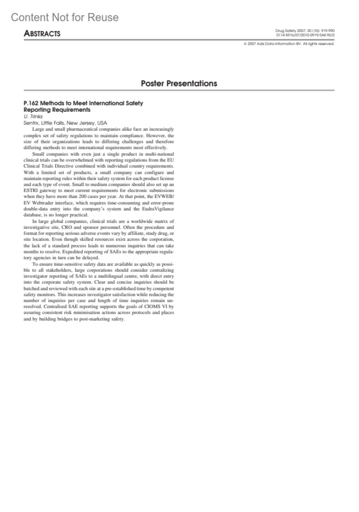 Methods to Meet International Safety Reporting RequirementsTrinks, UAuthor informationSentrx, Little Falls, New Jersey, USADrug Safety 30(10):p 919-990, 2007.Copyright © 2007 Adis Data Information BV