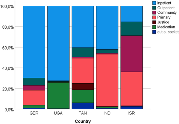 Inpatient care as a share of total expenditure remained substantial in both Tanzania (40.40%) and India (42.22%), but primary care had the greatest share of costs in India (50.72%). Tanzanian respondents included the highest expenditures for the justice system (6.21%); this could reflect a lack of access to healthcare services. Israel spent the lowest proportion (15.40%) of resources on inpatient care, while remaining expenditures were distributed relatively equally between community (35.12%) and primary care (33.01%), with a lesser share for outpatient treatment (13.35%).