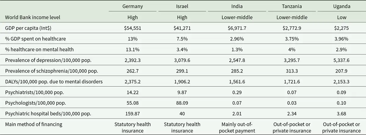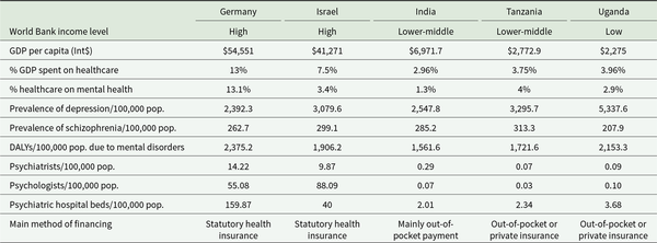 Contextual information on country characteristics was taken from published literature, including gross domestic product (GDP) per capita (World Bank, ), total governmental health expenditure as a percentage of GDP and proportion of expenditure allocated to mental health (GBD 2019 Mental Disorders Collaborators, ). Funding structures and mental health service capacity were taken from the WHO Mental Health Atlas’ 2020 (Germany, Tanzania and Uganda) (World Health Organization, ) and 2017 (India and Israel) (Jaeschke et al., ).