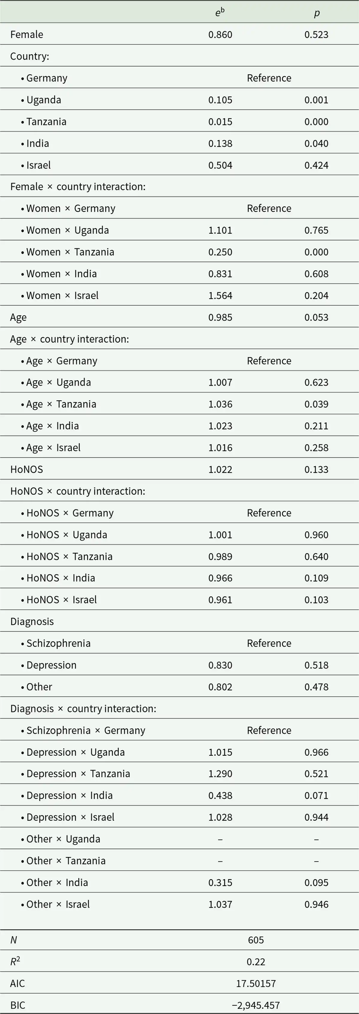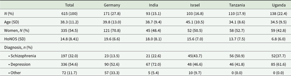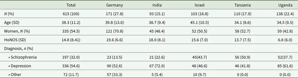 Baseline characteristics of all 615 participants are reported in Table 2. The mean age was 38.3 (SD 11.2 years), and the study was broadly balanced; 54.5% were women. The mean HONOS score was 14.8, ranging from 19.6 in Germany to 6.8 in Uganda. In total, 54% had a depression diagnosis.