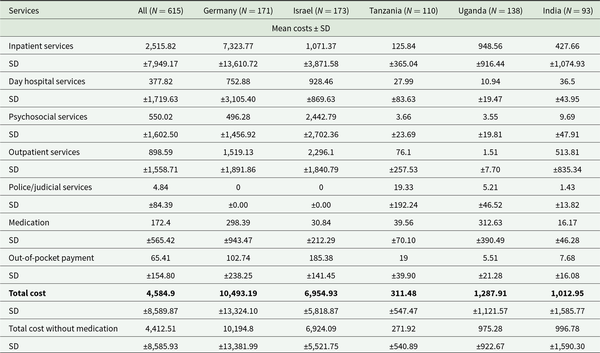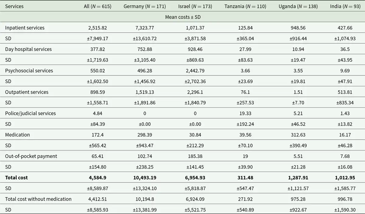 Our study aims to compare total costs of illness (COIs) in people living with mental disorders in a standardized way across five countries – covering three of the four categories of the World Bank income scale: Germany and Israel (high income), India and Tanzania (lower middle income) and Uganda (low income). The countries provide a spectrum of policy and practice contexts. The two high-income countries are examples of different approaches to the management of mental disorders. Reform in Israel in 2015 moved responsibility for mental health from the Ministry of Health to four social health insurers with the aim of integrating mental health into general health services with more focus on community-based care (Gal et al., ). In contrast, the German system has not experienced this transformation and has continued to operate a model dominated by psychiatric inpatient care and less integration with community services (Wiegand et al., ). Indian national mental health policy, coupled with reforms to expand access to publicly funded healthcare, has put a focus on community mental health services (Mahapatra and Seshadri, ). Uganda has had a national mental health policy for almost 30 years, which also commits to more community-focused care (Atewologun et al., ), while Tanzania represents a country with little history of mental health policy development (Atewologun et al., ).