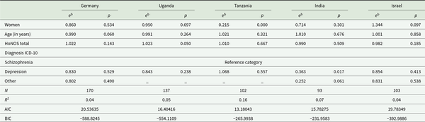 Results of country-specific GLM regression models in Table 4 show that gender was only significant in Tanzania where being a woman was associated with lower expenditure (eb = 0.215; p = 0.000). Diagnosis was only significantly associated with total mental health costs in India, where compared to schizophrenia, a diagnosis of depression was associated with lower expenditure (eb = 0.363; p = 0.017). Age and HoNOS scores (social disability) were not significantly associated with total costs in any country. The R2 of 0.16 indicates that 16% of the total cost variance could be explained by the variables in the regression model for Uganda, while the variance explanation for the other countries ranged between 4% and 7%. The residual plots in Supplementary eTables 1–5 indicate deviances from the requirement of normal distribution, particularly for the Tanzanian and for the Indian sample. While the Bayesian information criterion (BIC) suggests the best fit for the German model, the Akaike information criterion is lowest for the Tanzanian model. This indicates that the ratio between the sample size and the number of model variables is better in the German model.