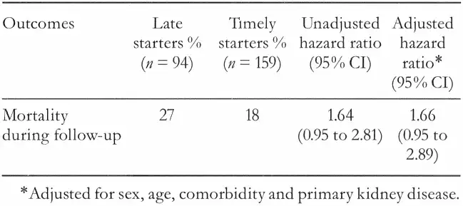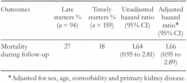 Mortality risk was not significantly greater for people starting dialysis later than recommended. For timely starters, adjusted survival difference after three years on dialysis was 2.5 months (95% CI 1.1 to 4.0 months; Table 1).
