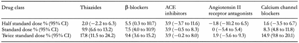 Three hundred and fifty four randomised trials (56,000 people) met inclusion criteria. Single drugs: At any given dose, no single class of drug was significantly more effective at lowering blood pressure than another. Combination drugs: One hundred and nineteen RCTs compared two different drugs with each drug alone. Six of 10 possible combinations of drug classes acted additively to reduce blood pressure. Adverse effects: No drug class was consistently more likely to produce adverse effects than any other class across three different doses (see Table 1). There was no additive effect of adverse effects when drugs were used in combination.