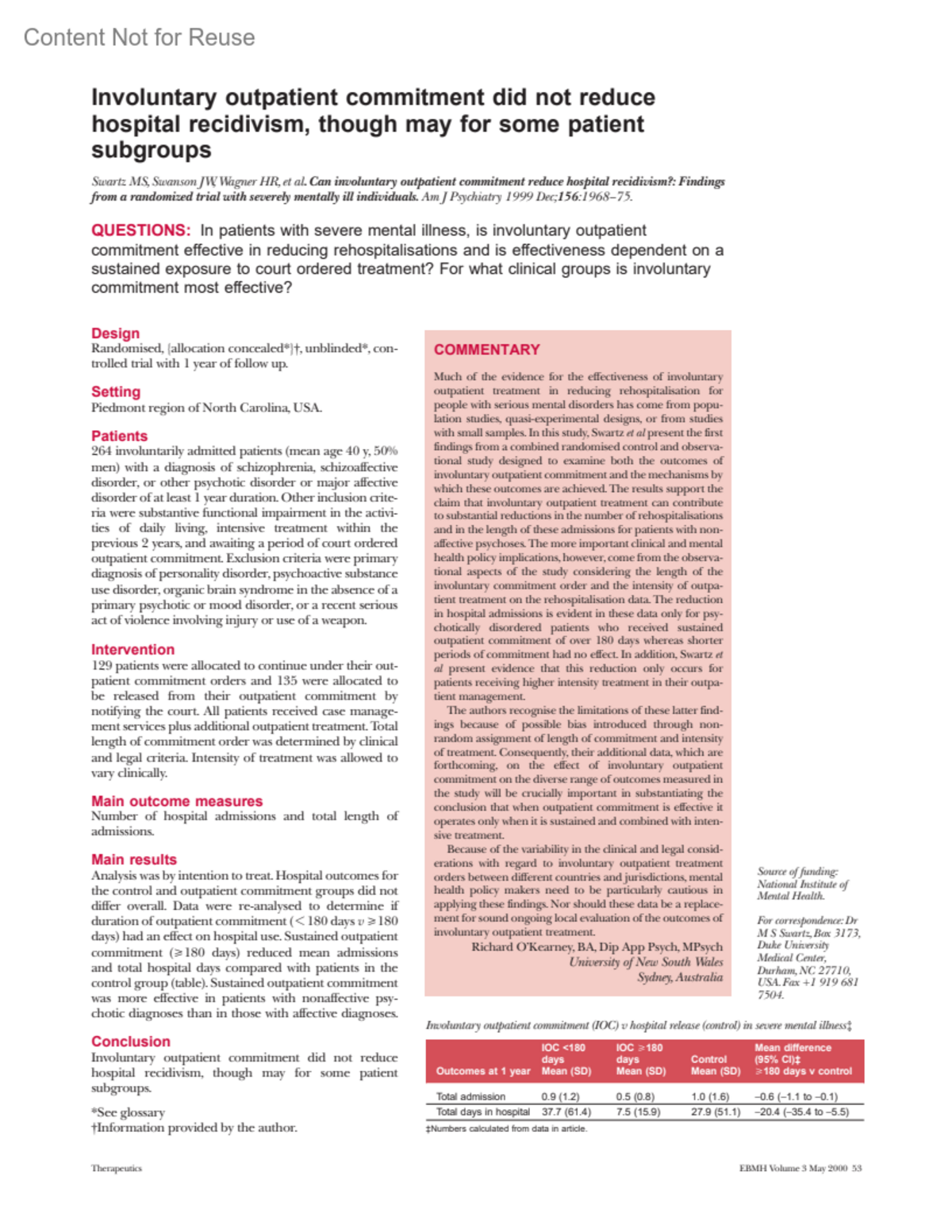 Swartz MS, Swanson JW, Wagner HR, et al . Can involuntary outpatient commitment reduce hospital recidivism?: Findings from a randomized trial with severely mentally ill individuals. Am J Psychiatry 1999 Dec;156:1968–75.QUESTIONS: In patients with severe mental illness, is involuntary outpatient commitment effective in reducing rehospitalisations and is effectiveness dependent on a sustained exposure to court ordered treatment? For what clinical groups is involuntary commitment most effective?