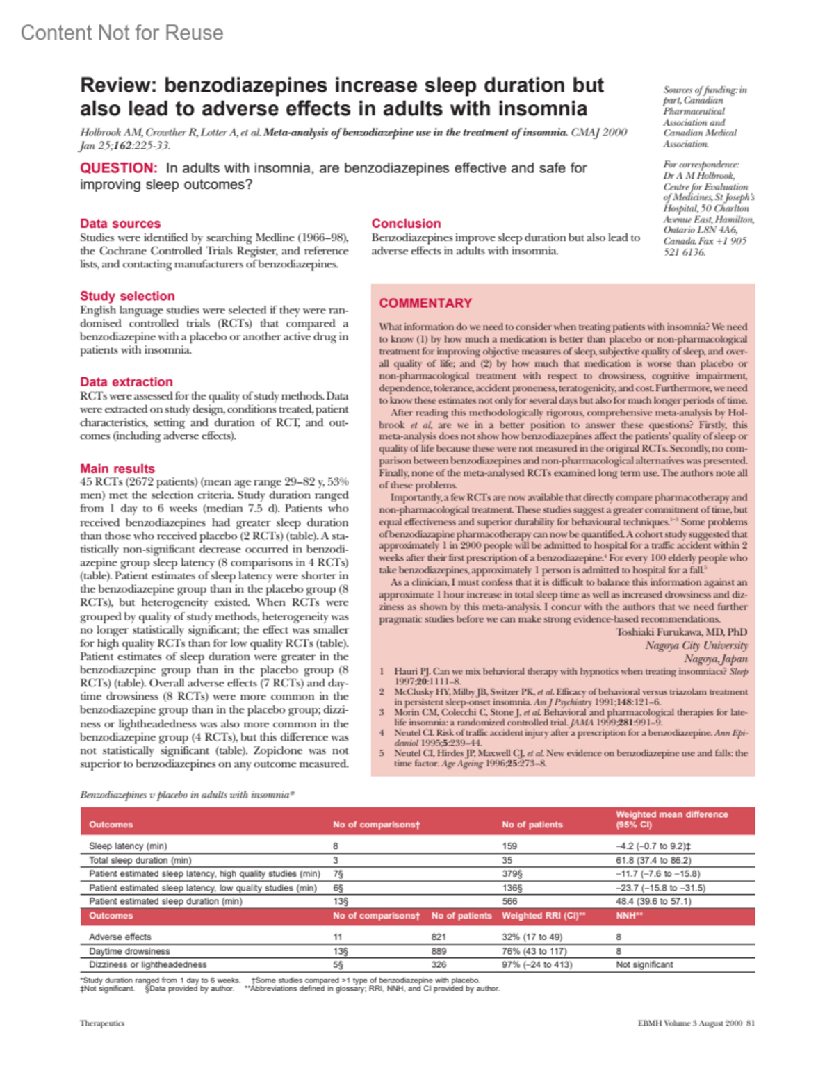 Review: benzodiazepines increase sleep duration but also lead to adverse effects in adults with insomniaMeta-analysis of benzodiazepine use in the treatment of insomnia.