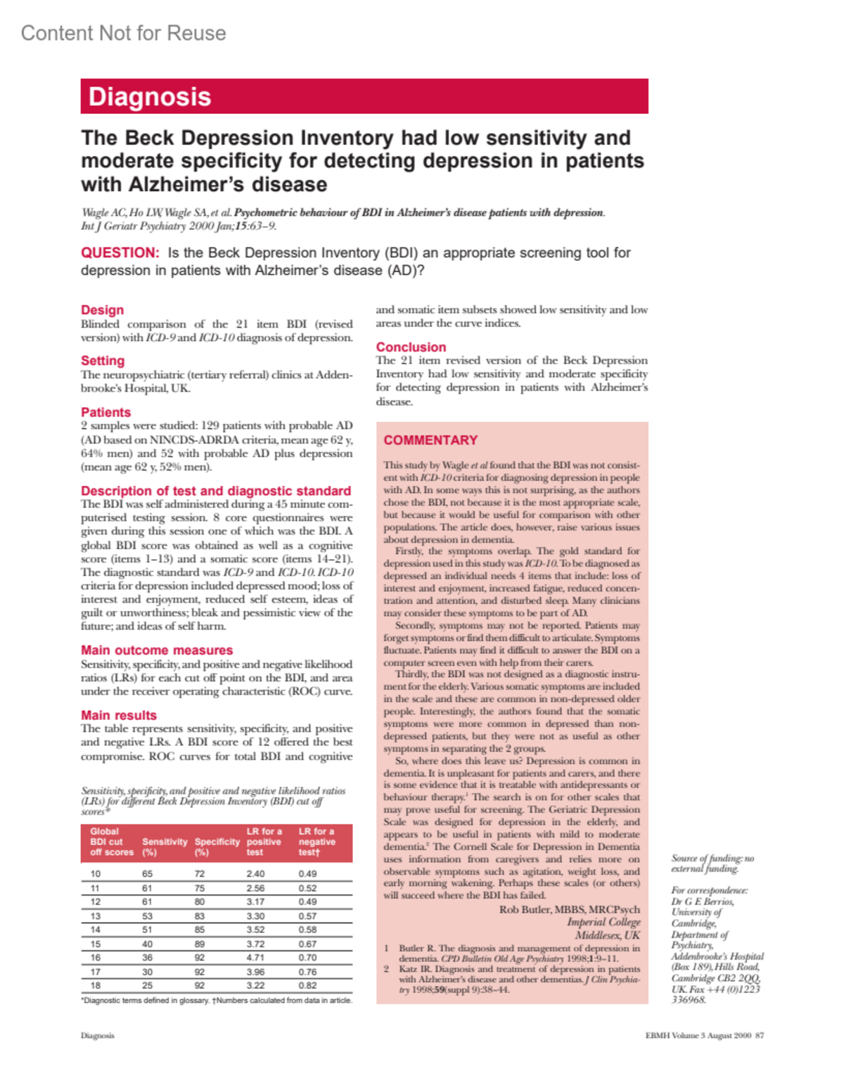 The Beck Depression Inventory had low sensitivity and moderate specificity for detecting depression in patients with Alzheimer's disease