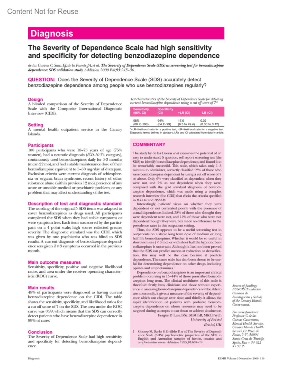 The Severity of Dependence Scale had high sensitivity and specificity for detecting benzodiazepine dependence