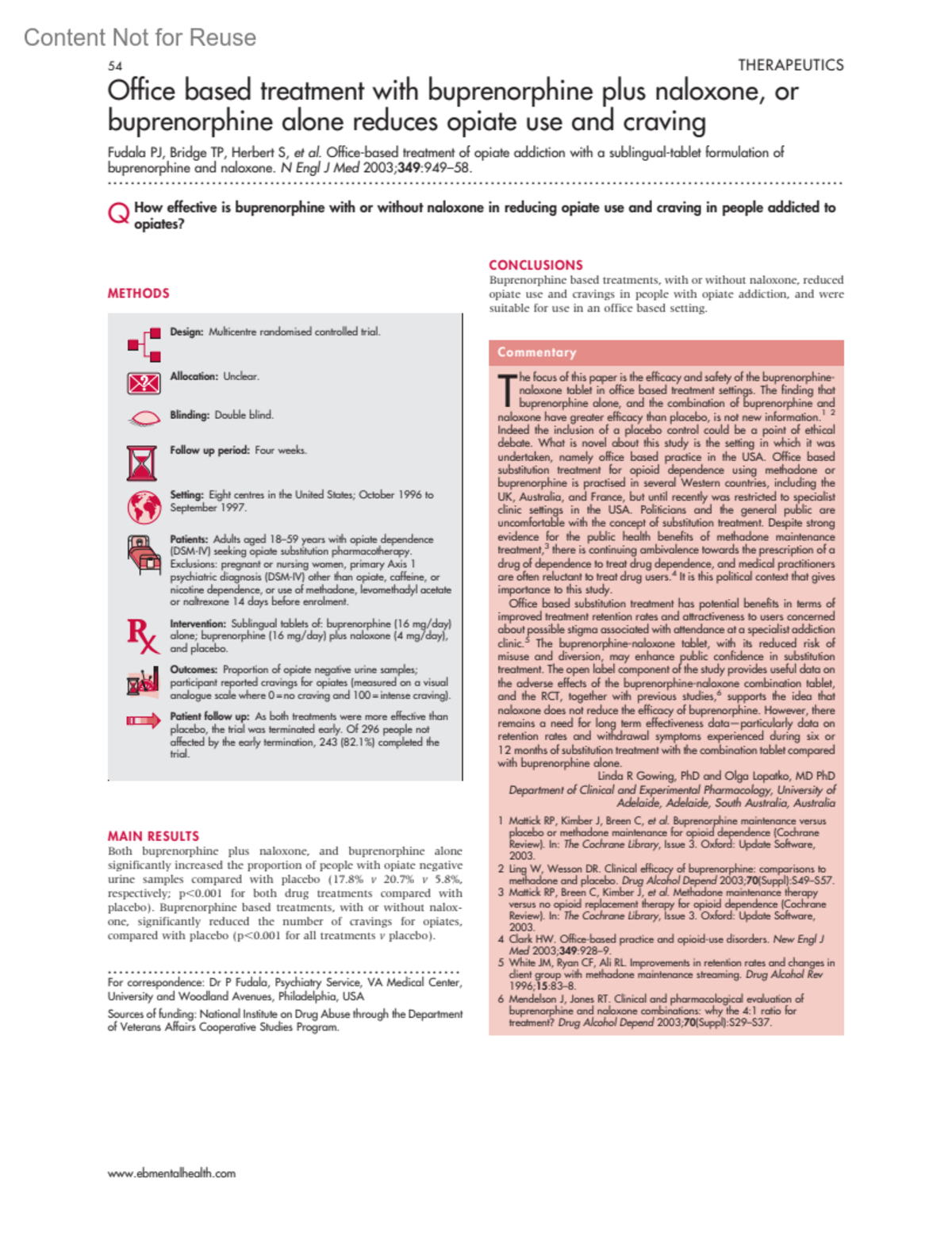 Office based treatment with buprenorphine plus naloxone, or buprenorphine alone reduces opiate use and cravingOffice-based treatment of opiate addiction with a sublingual-tablet formulation of buprenorphine and naloxone.