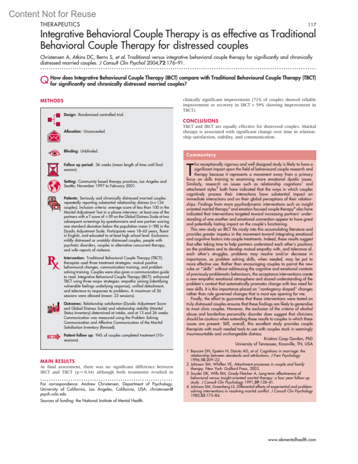 Integrative Behavioral Couple Therapy is as effective as Traditional Behavioral Couple Therapy for distressed couplesTraditional versus integrative behavioral couple therapy for significantly and chronically distressed married couples.