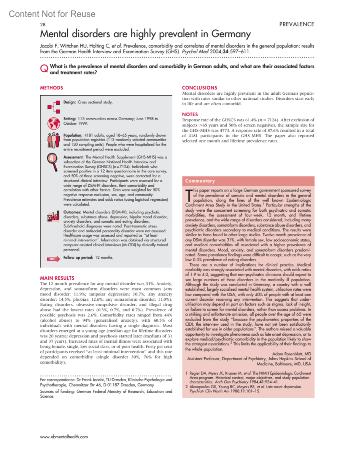 Jacobi F, Wittchen HU, Holting C, et al. Prevalence, comorbidity and correlates of mental disorders in the general population: results from the German Health Interview and Examination Survey (GHS). Psychol Med 2004; 34: 597–611.JacobiFWittchenHUHoltingCet alPrevalence, comorbidity and correlates of mental disorders in the general population: results from the German Health Interview and Examination Survey GHS.Psychol Med200434597-611Q What is the prevalence of mental disorders and comorbidity in German adults, and what are their associated factors and treatment rates?