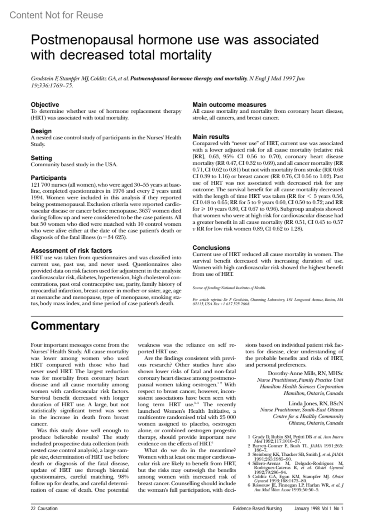 Grodstein F, Stampfer Mj, Colditz Ga, Et AL. Postmenopausal hormone therapy and mortality. N Engl J Med 1997 Jun 19;336:1769–75.