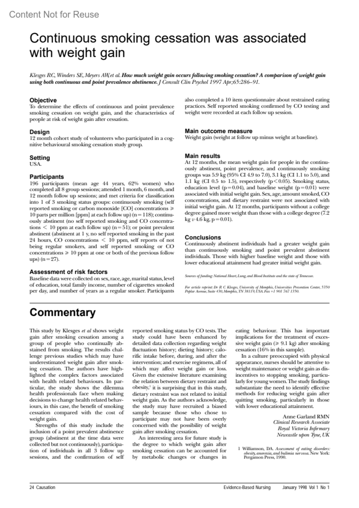 Klesges Rc, Winders Se, Meyers Aw, Et AL. How much weight gain occurs following smoking cessation? A comparison of weight gain using both continuous and point prevalence abstinence. J Consult Clin Psychol 1997 Apr;65:286–91.