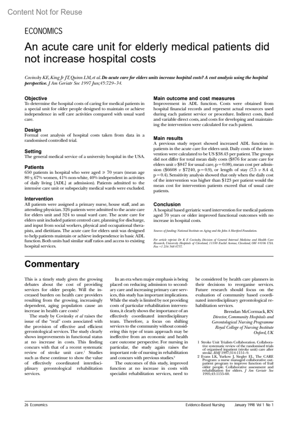 Covinsky Ke, King Jr Jt, Quinn Lm, Et AL. Do acute care for elders units increase hospital costs? A cost analysis using the hospital perspective. J Am Geriatr Soc 1997 Jun;45:729–34.