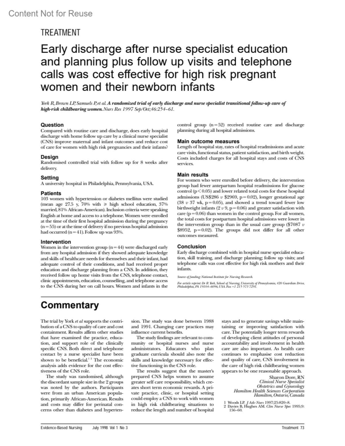 York R, Brown LP, Samuels P, et al. A randomized trial of early discharge and nurse specialist transitional follow-up care of high-risk childbearing women. Nurs Res 1997 Sep/Oct;46:254–61.