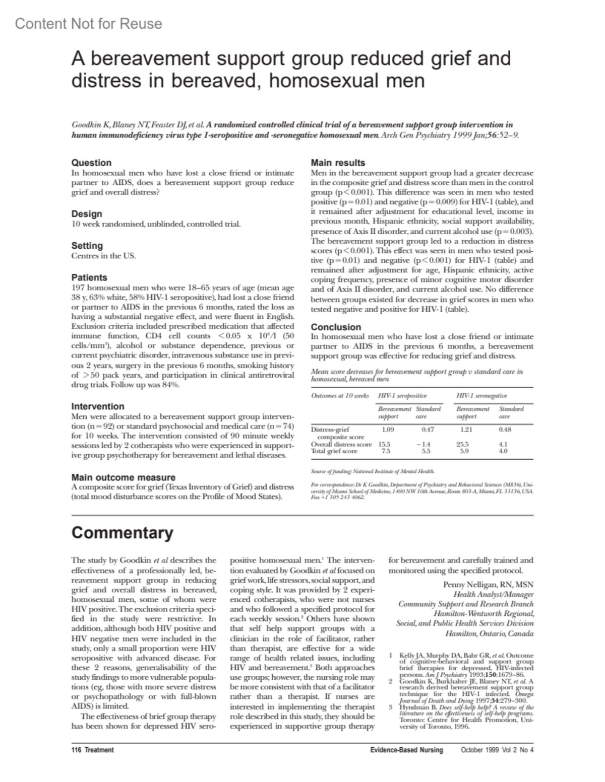 A bereavement support group reduced grief and distress in bereaved, homosexual men