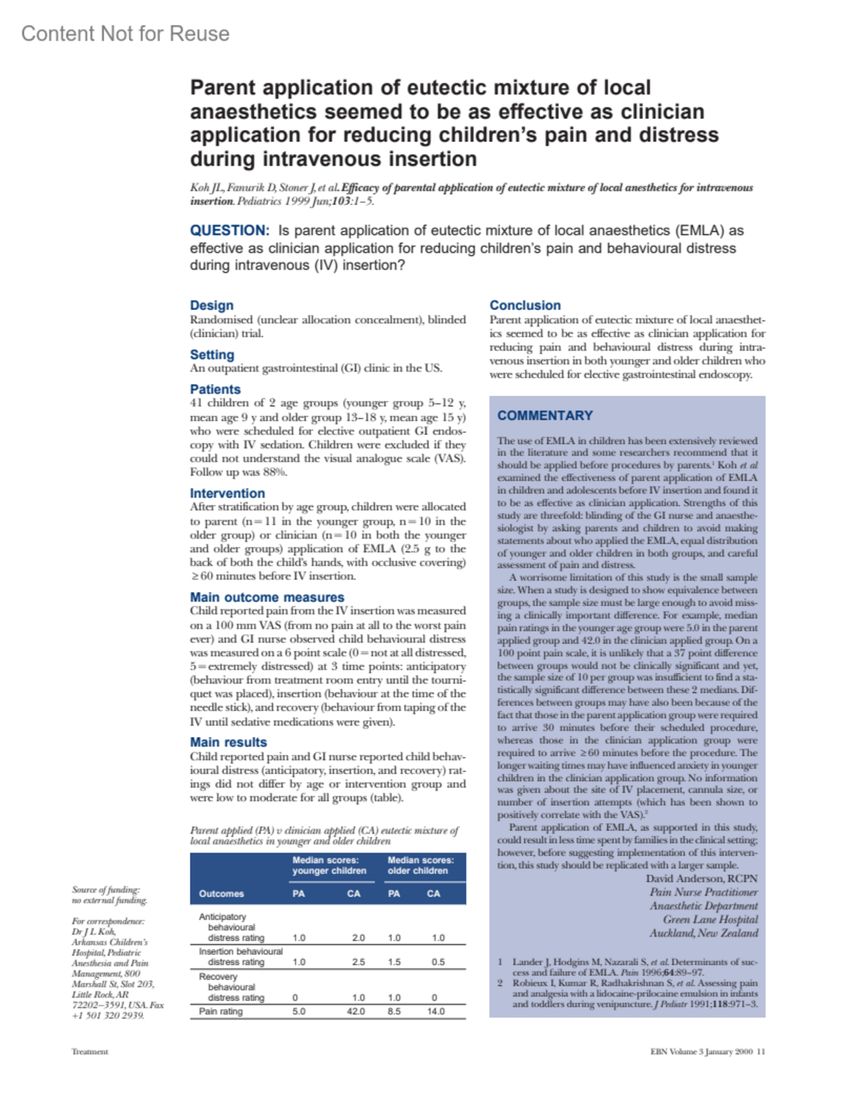 Parent application of eutectic mixture of local anaesthetics seemed to be as effective as clinician application for reducing children's pain and distress during intravenous insertion