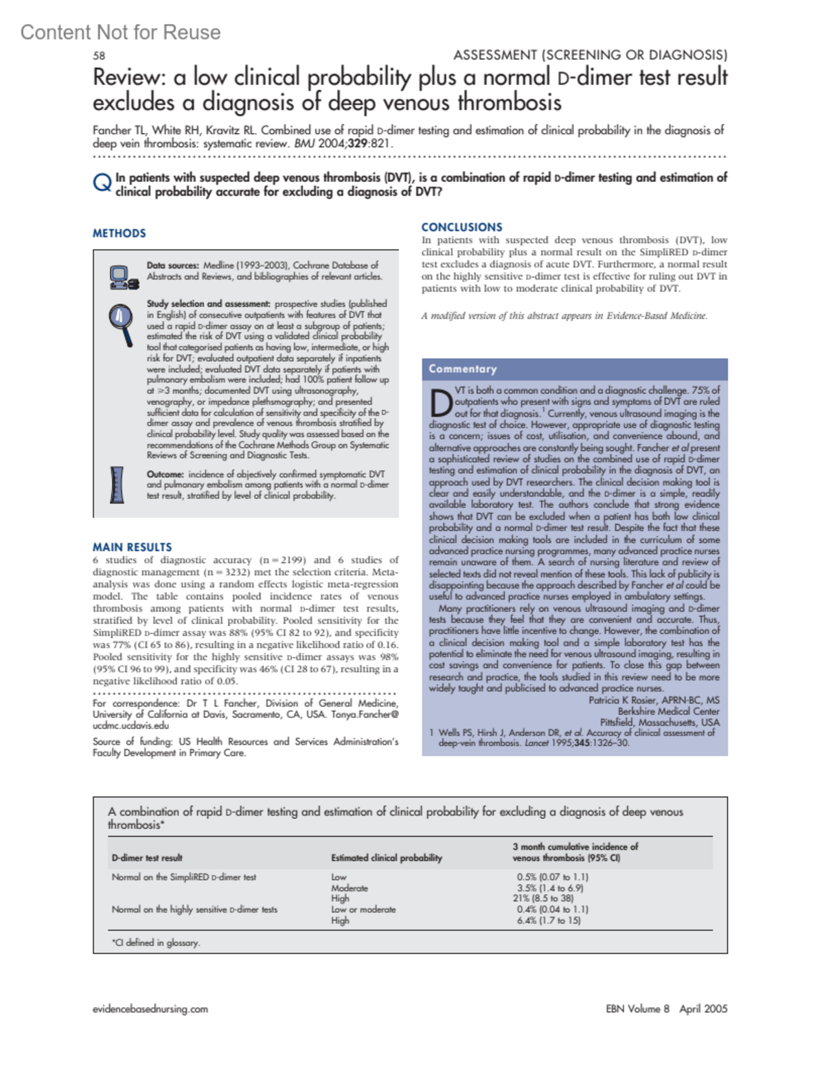 Review: a low clinical probability plus a normal d-dimer test result excludes a diagnosis of deep venous thrombosisCombined use of rapid d-dimer testing and estimation of clinical probability in the diagnosis of deep vein thrombosis: systematic review.