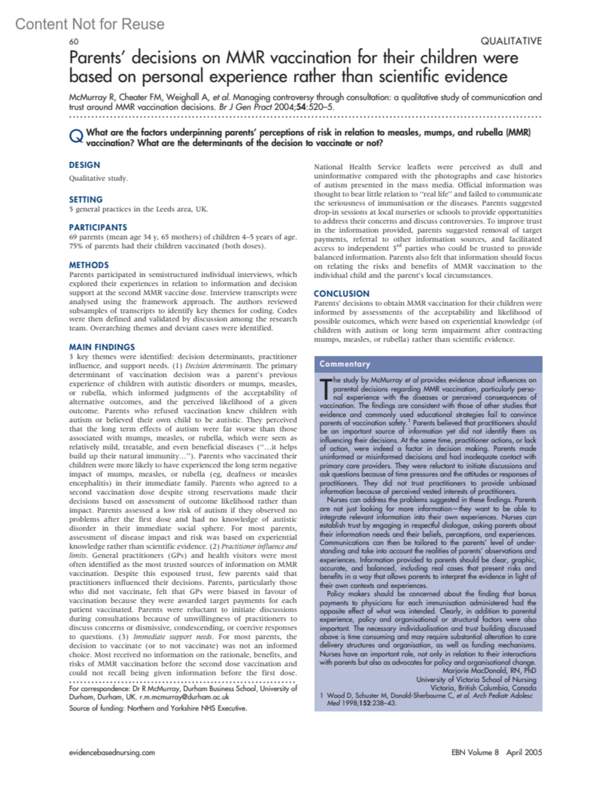 Parents’ decisions on MMR vaccination for their children were based on personal experience rather than scientific evidenceManaging controversy through consultation: a qualitative study of communication and trust around MMR vaccination decisions.