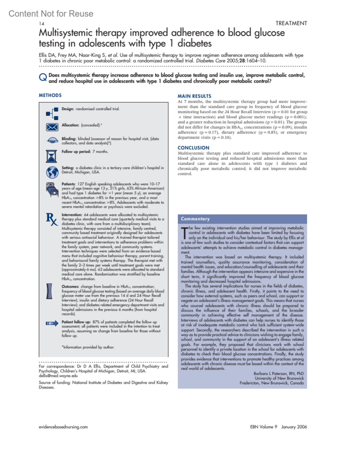 Ellis DA, Frey MA, Naar-King S, et al. Use of multisystemic therapy to improve regimen adherence among adolescents with type 1 diabetes in chronic poor metabolic control: a randomized controlled trial. Diabetes Care 2005; 28: 1604–10.EllisDAFreyMANaar-KingSet alUse of multisystemic therapy to improve regimen adherence among adolescents with type 1 diabetes in chronic poor metabolic control: a randomized controlled trial.Diabetes Care2005281604-10Q Does multisystemic therapy increase adherence to blood glucose testing and insulin use, improve metabolic control, and reduce hospital use in adolescents with type 1 diabetes and chronically poor metabolic control?