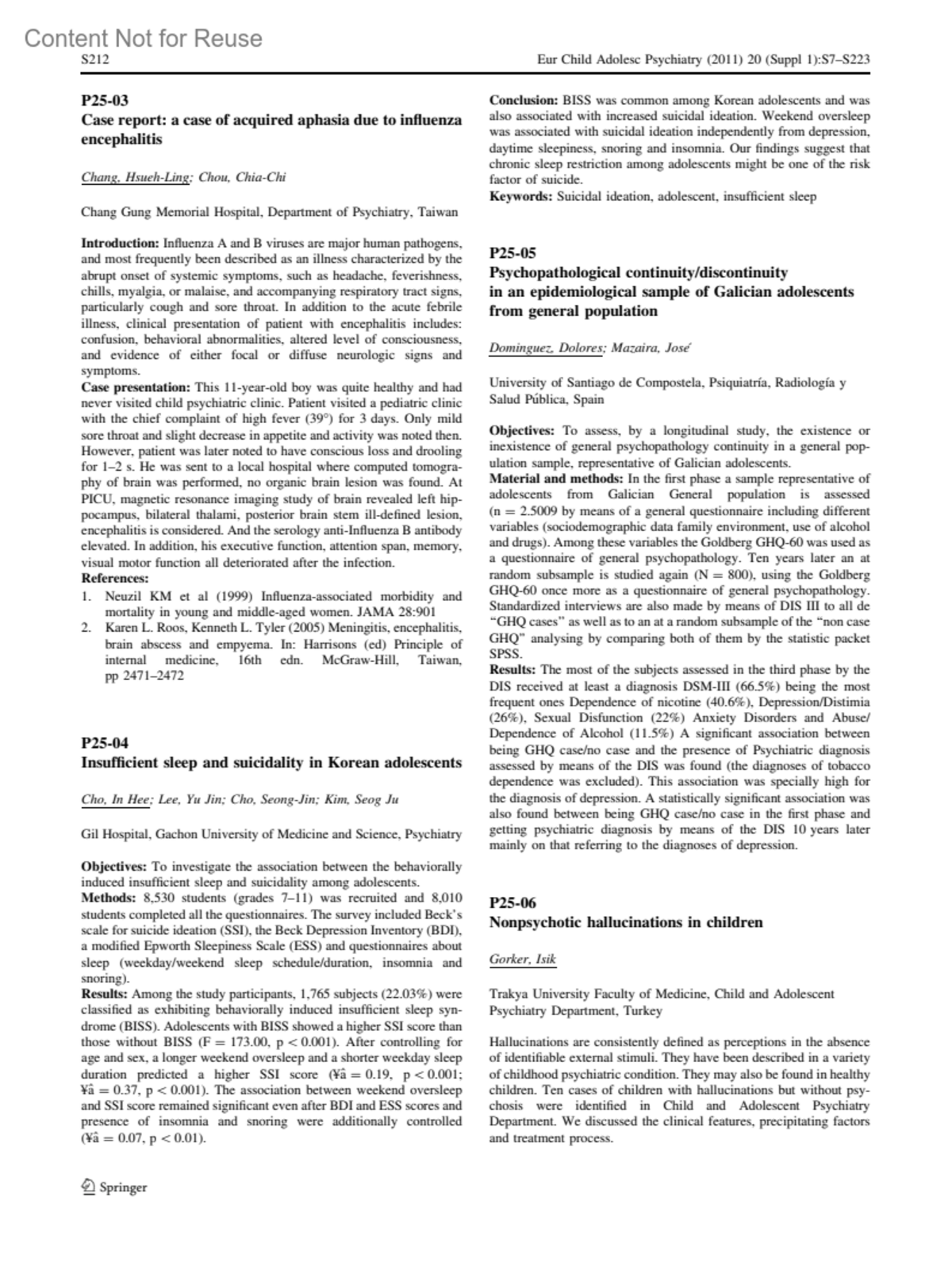European Child & Adolescent Psychiatry 20:p S212, June 2011.