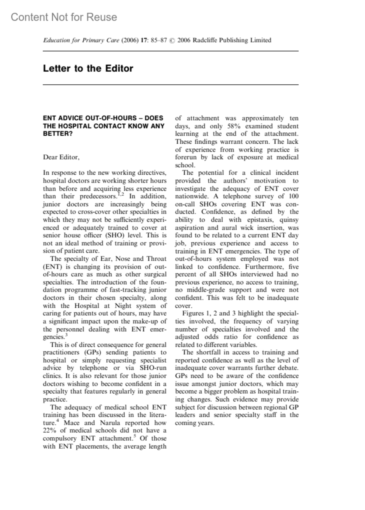 ENT ADVICE OUT-OF-HOURS – DOES THE HOSPITAL CONTACT KNOW ANY BETTER?DAVIS, SIMONSHO, ENTAuthor informationCompeting interestThe full work is awaiting ENT journal publication.Correspondence to: Mr Simon Davis, c/o 106 Nibley Road, Shirehampton, Bristol BS11 9XW, UK. Email: [email protected]Education for Primary Care 17(1):p 85-87, 2006.Copyright © 2006 Radcliffe Publishing Ltd.