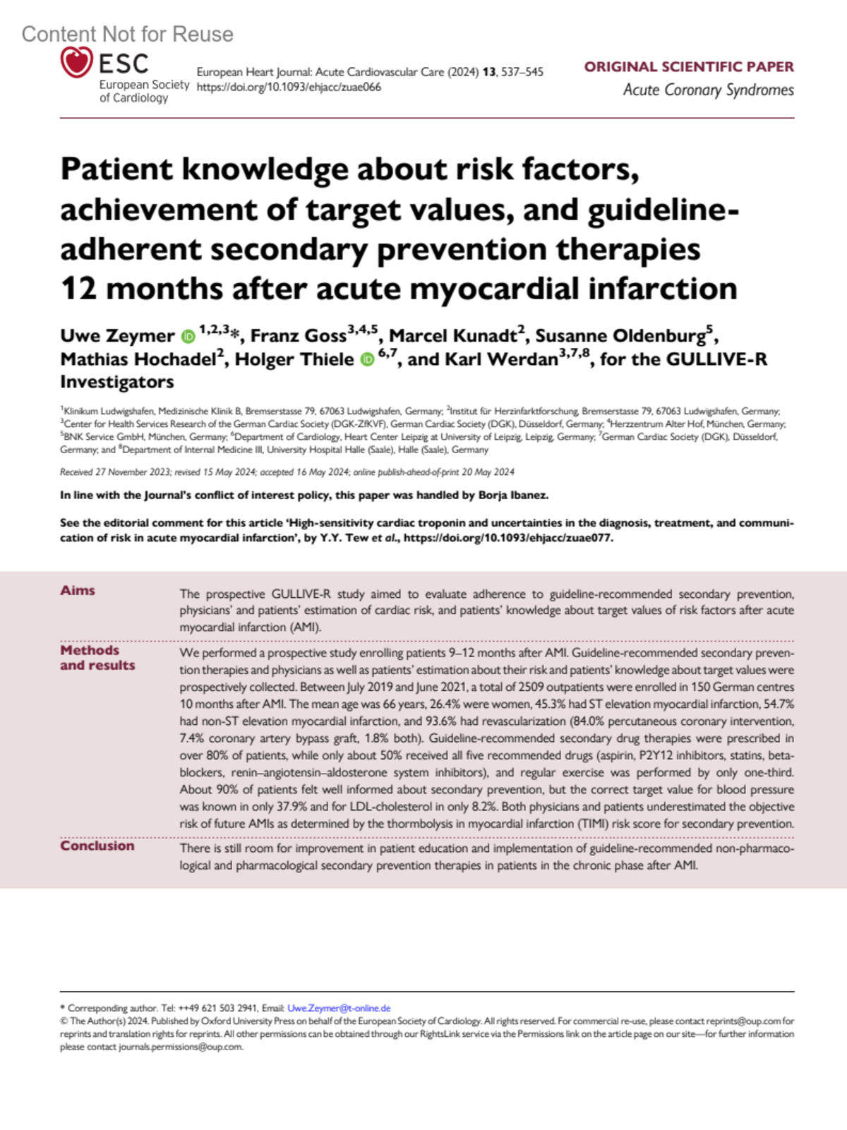 Patient knowledge about risk factors, achievement of target values, and guideline-adherent secondary prevention therapies 12 months after acute myocardial infarction