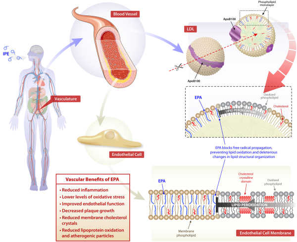 Eicosapentaenoic acid also has direct vascular effects that impact the progression of atherosclerosis as compared to other ω3-PUFAs. In mice that lack apolipoprotein E (Apoe−/−) fed a Western diet supplemented with EPA (1%, w/w) or DHA (1%, w/w) for 3 weeks, EPA treatment reduces plaque volume as compared to DHA. Eicosapentaenoic acid and its metabolites, especially 12-hydroxyeicospentaenoic acid (12-HEPE), preferentially associate with thin-cap plaques and accumulation of anti-inflammatory M2 macrophages, while DHA associates with plaques of various sizes. In the aortic root, total EPA and 12-HEPE levels follow a concentration gradient from the vascular endothelium to the media. In patients with coronary artery disease (CAD), treatment with EPA improves high-density lipoprotein mediated cholesterol efflux along with antioxidant and anti-inflammatory effects. In human endothelial cells, EPA-enriched HDL increases resolvin E3 production while reducing cytokine-stimulated vascular cell adhesion molecule 1 (VCAM-1) expression. As observed in Apo-B containing particles, the lipophilic properties and molecular dimensions of EPA allow it to insert more efficiently into the HDL particle, with improved antioxidant function, as compared to DHA.