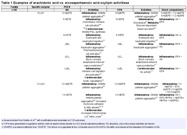 Instances in which the effect of EPA-oxylipins are different from the AA-homolog are also reported, with examples both where the EPA-oxylipin is more potent than the AA-homolog, and also where it is less potent. Among 5-LOX pathway metabolites, the EPA-derived 5-KEPE is 10-fold less potent than the AA-derived 5-KETE in mobilizing cytosolic Ca2+ in human neutrophils, and it is less potent in stimulating neutrophil or eosinophil migration. Another EPA-oxylipin derived from 5-LOX (5-HEPE) acts on GPR119 to produce an insulinogenic effect but the AA homolog (5-HETE) has only half the effect. Hence, different GPR119-dependent insulinogenic responses among individuals could potentially be explained by availability of cell membrane AA and EPA, independent of genetic polymorphisms. By considering the interactions of PUFAs with each other, a better assessment of how the bioactivities of mixtures are established can be derived.