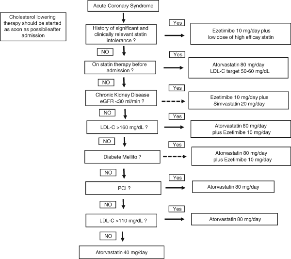 Cholesterol lowering therapy during admission in patients with acute coronary syndrome. LDL-C, LDL cholesterol, PCI, percutaneous coronary intervention. Solid lines represent recommendations, dotted lines represent suggestions to be considered in the clinical context.