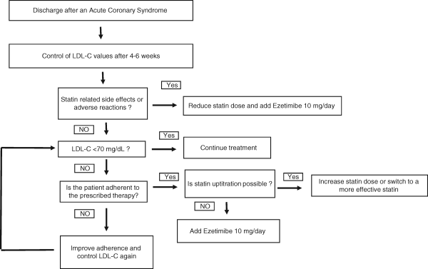 Patients affected by acute coronary syndromes (ACS) are at high risk of further ischaemic cardiovascular events both in the short and medium term after discharge., Effective reduction of LDL cholesterol (LDL-C) levels obtained with statin treatment after an ACS has been associated with a substantial decrease in cardiovascular morbidity., In fact, there is undisputed evidence that every statin-induced reduction of LDL-C of about 35–40 mg/dL correlates with a 20–25% decrease in the relative risk of subsequent ischaemic cardiovascular events.,