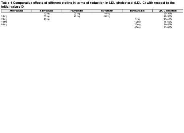 The most recent ESC guidelines on the management of ACS confirm the need for an early treatment with high efficacy statins, which should be effective in reducing LDL-C of at least 50%. The only available statin agents that may possibly achieve such effects are atorvastatin (dosage of 40–80 mg/day) and rosuvastatin (dosage of 20–40 mg/day) (Table 1). In the same guidelines on the management of ACS the goal of reducing LDL-C below 70 mg/dL is also confirmed. In those cases where, despite treatment with the maximum tolerated statin dose, it is not possible to reach the recommended LDL-C target, the addition of ezetimibe to cholesterol lowering therapy should be considered (recommendation of level IIa, class of evidence B).