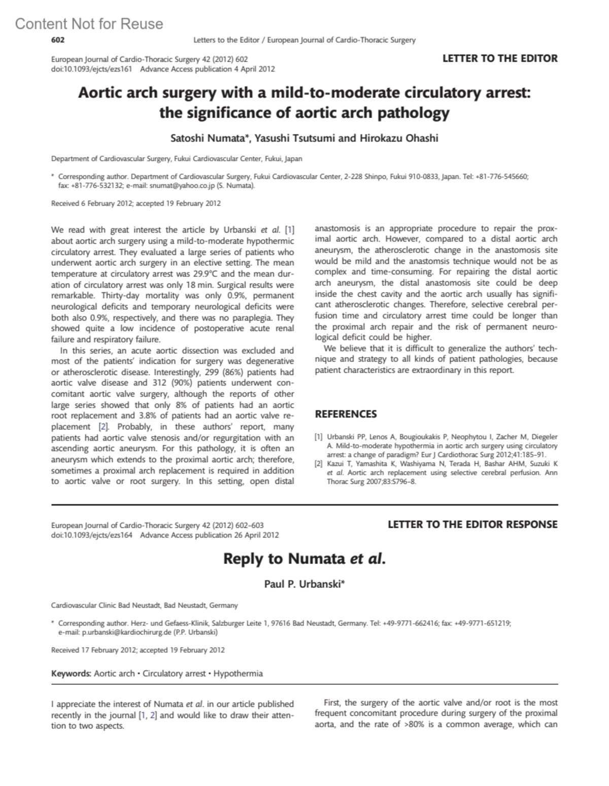 Reply to Numataet al.Urbanski, Paul P.Author informationCardiovascular Clinic Bad Neustadt, Bad Neustadt, Germany* Corresponding author. Herz- und Gefaess-Klinik, Salzburger Leite 1, 97616 Bad Neustadt, Germany. Tel: +49-9771-662416; fax: +49-9771-651219; e-mail: [email protected] (P.P. Urbanski)Received February 17, 2012; accepted February 19, 2012European Journal of Cardio-Thoracic Surgery 42(3):p 602-603, September 2012. | DOI: 10.1093/ejcts/ezs164Copyright © Oxford University Press 2015