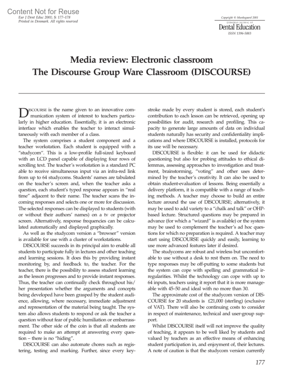 Media reviewElectronic classroom The Discourse Group Ware Classroom (DISCOURSE)Woodman, T.Pee, B.Author informationDental Auxiliary School, Queen Mary, University of London.European Journal of Dental Education 5(4):p 177-178, November 2001.Copyright © 2001 Munksgaard International Publishers Ltd.