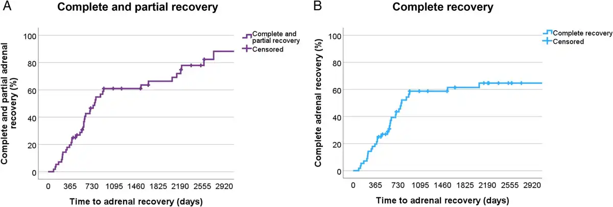 Adrenal recovery after mitotane discontinuation. Kaplan–Meier analysis of (A) time to complete and partial adrenal recovery and (B) time to complete adrenal recovery only.