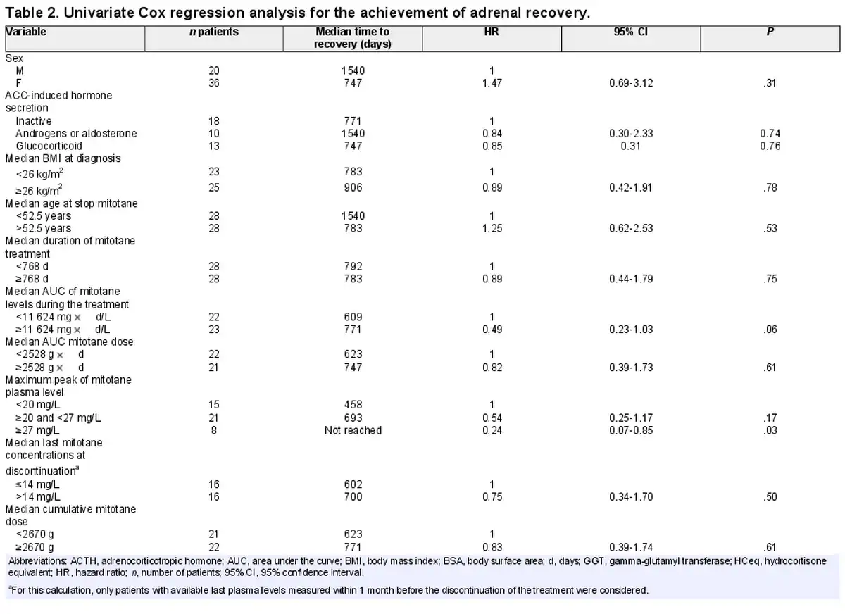 An explorative analysis for potential predictive factors influencing time to adrenal recovery has been performed. Table 2 depicts the detailed results for 24 factors including several clinical characteristics and variables on mitotane treatment as well as on replacement therapies (Table 2).