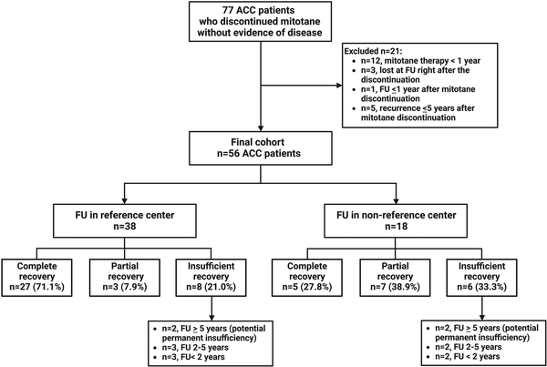 Patients with histologically proven ACC and adjuvant mitotane treatment for a minimum of 12 months were included if they discontinued mitotane at a time when no evidence of disease was present. Patients with lack of relevant information on primary diagnosis or follow-up or with disease recurrence within the first 5 years after mitotane discontinuation before adrenal recovery and who started new medical treatment (including mitotane) were excluded. Patients with concomitant systemic adjuvant or neo-adjuvant anti-tumor treatment as well as radiotherapy of the tumor bed during mitotane treatment were also eligible. We consecutively enrolled all patients who qualified for these selection criteria that were treated with adjuvant mitotane between 2000 and 2020 in one of the reference centers. Follow-up was closed in December 2022. Patients initially treated in our centers who had their follow-up visits after the discontinuation of mitotane in other non-reference centers (including general practitioner or other hospitals treating <25 patients with ACC per year) were also included.