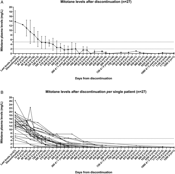 Mitotane plasma levels after its discontinuation. Decrease of the mitotane plasma levels (mg/L) after its discontinuation represented (A) as mean ± standard deviation for the cohort of patients with detailed follow-up information (n = 27) and (B) per single patient. Only patients with a last available mitotane plasma levels measured within 1 month before the discontinuation of the treatment were included. Time is reported in days from the mitotane discontinuation. The number of patients evaluated at each analyzed time point is reported in brackets.