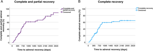 Adrenal recovery after mitotane discontinuation. Kaplan–Meier analysis of (A) time to complete and partial adrenal recovery and (B) time to complete adrenal recovery only.
