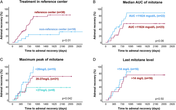 Predictive factors of time to adrenal recovery after mitotane discontinuation. Kaplan–Meier analysis of time to adrenal recovery (A) depending on treatment in reference center, (B) depending on the median area under the curve (AUC) of mitotane levels during the treatment period, (C) depending on the maximum peak of mitotane plasma level during the treatment period, and (D) depending on the last mitotane concentrations at discontinuation. Only patients with last mitotane plasma levels measured within 1 month before the mitotane discontinuation were included in the analysis of last mitotane concentrations. P values were calculated using the log-rank test.